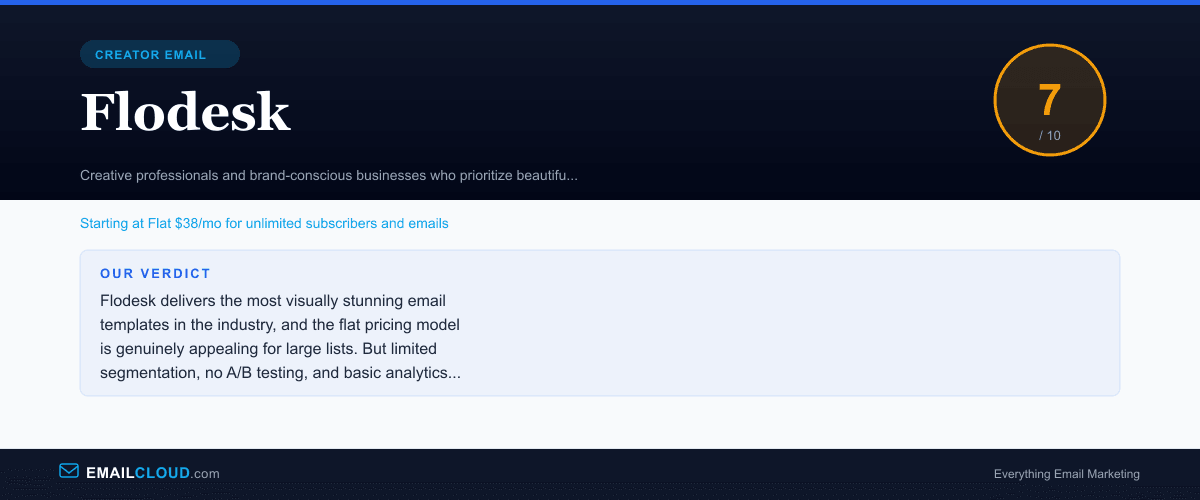 Flodesk is the email platform you choose when brand aesthetics matter more than marketing sophistication. The templates are genuinely beautiful — better than anything Mailchimp, MailerLite, or Kit produces out of the box. The flat $38/mo pricing is refreshingly simple and becomes a real bargain as your list grows. But the trade-off is significant: limited segmentation, no A/B testing, basic reporting, and fewer integrations than nearly every competitor. For creative professionals who send visually striking newsletters and do not need complex automation, Flodesk delivers exactly what it promises. For everyone else, the feature gaps are hard to overlook.