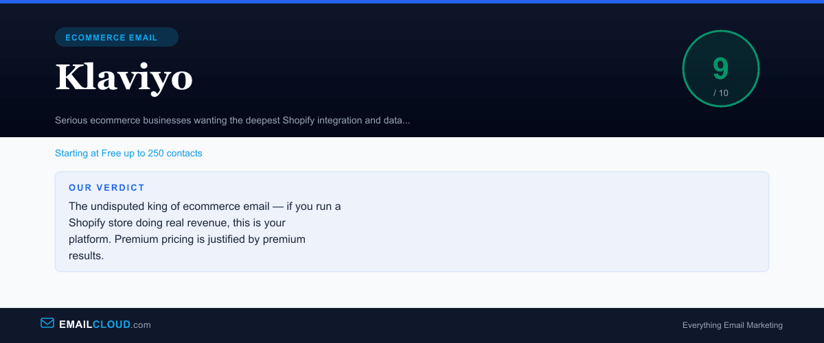 The undisputed king of ecommerce email — if you run a Shopify store doing real revenue, this is your platform. Premium pricing is justified by premium results.