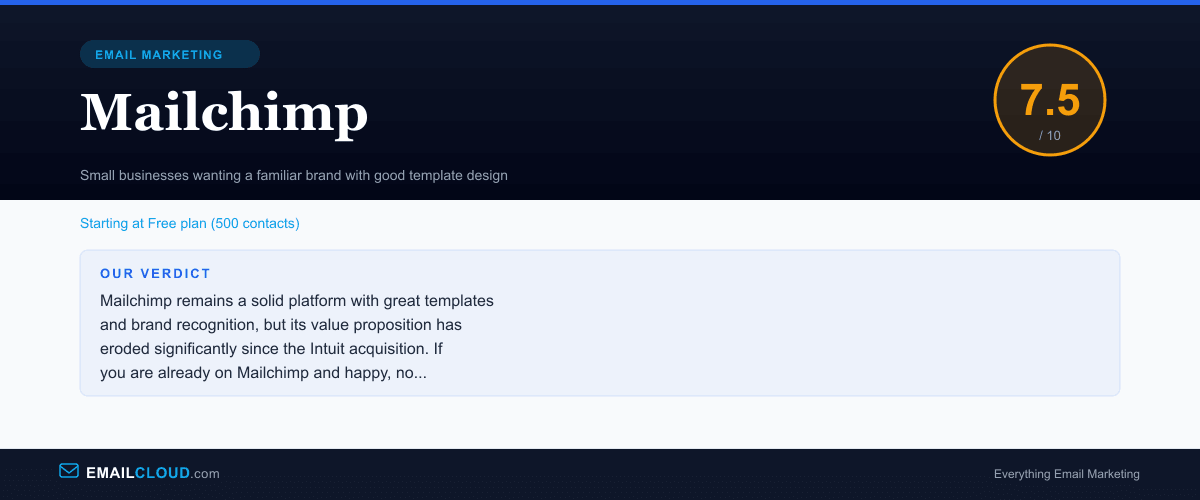 If you are already on Mailchimp, your data is organized, and your bill is manageable — there is no urgent reason to migrate. Switching platforms is never painless. But if you are evaluating email marketing tools for the first time in 2026, we would steer you toward GetResponse, MailerLite, or ActiveCampaign first, depending on your needs and budget. Mailchimp earns a 7.5 — solid, but no longer special.