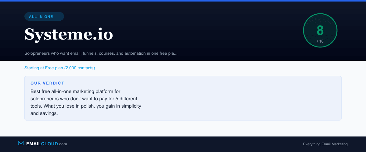 Systeme.io is not trying to be the best email platform, the best funnel builder, or the best course platform. It is trying to be the best value — and it succeeds. The free plan alone offers more combined functionality than many paid tools, and the paid plans remain aggressively competitive.