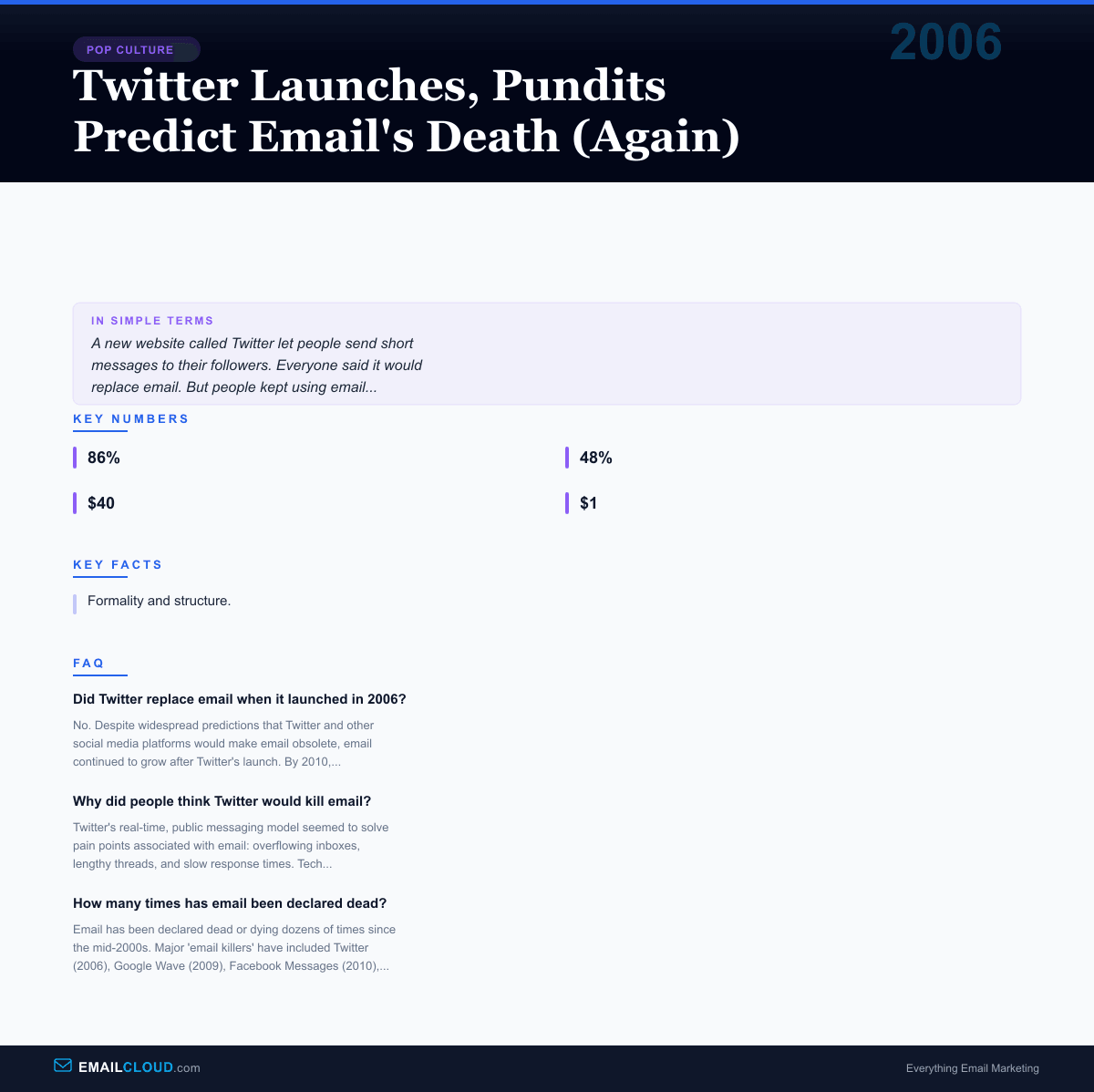 Twitter Launches, Pundits Predict Email's Death (Again) — visual summary and key facts infographic