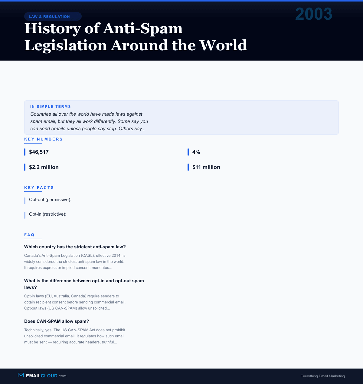The year 2003 was the tipping point. Spam had grown from an annoyance to a crisis — accounting for over half of all email traffic worldwide — and governments on every continent finally decided to do something about it. What followed was a patchwork of national laws, each taking a slightly different approach to the same problem. Some were strict. Some were permissive. Some were well-enforced. Some were purely symbolic. Together, they represent the global community’s collective, messy, and ongoing attempt to keep email usable.