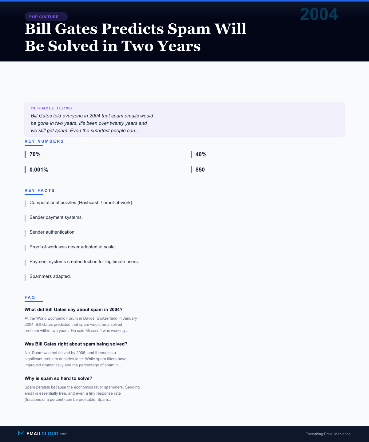 Bill Gates Predicts Spam Will Be Solved in Two Years — visual summary and key facts infographic