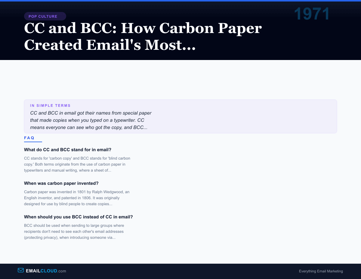 Early email systems on ARPANET and university networks adopted these conventions almost immediately. The terminology was familiar to the office workers who were the primary users of early email. Even though electronic copies didn’t involve carbon paper — the copy was just another identical digital message — the naming convention stuck because it accurately described the social function: CC means visible copy recipients, BCC means hidden copy recipients.