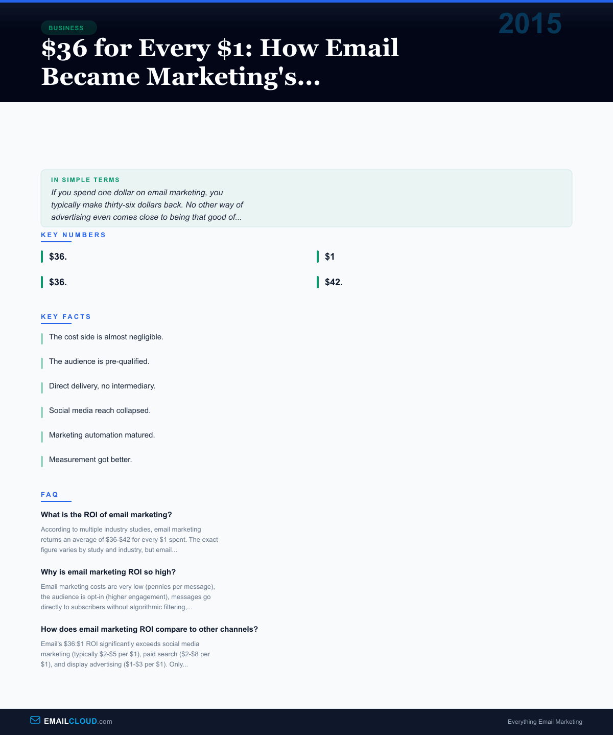 There’s a number that email marketers recite like scripture: $36. As in, for every $1 spent on email marketing, the average return is $36. Some studies put it higher — the Data & Marketing Association (DMA) has reported figures as high as $42. Others are more conservative. But even the lowest credible estimates place email marketing’s return on investment far above any other digital marketing channel.