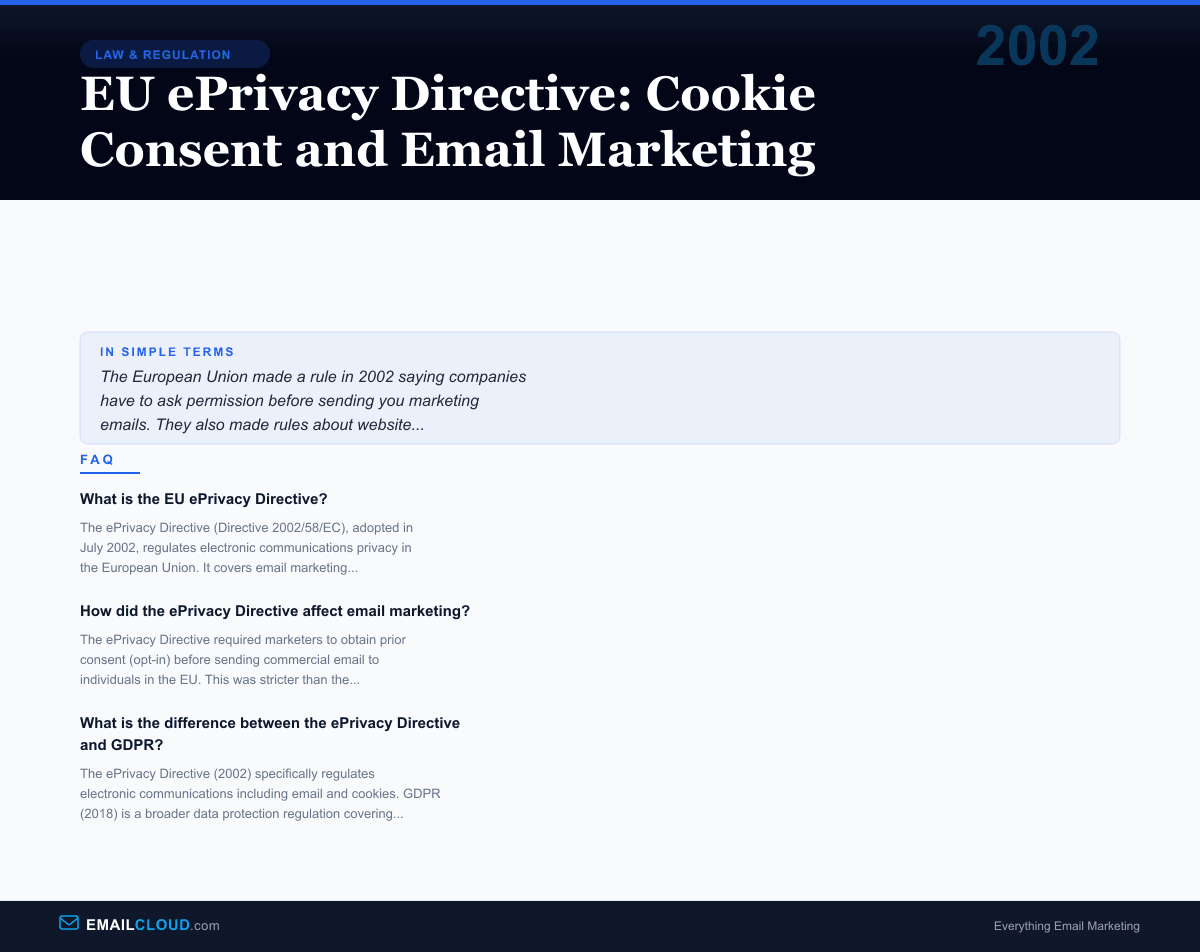 The ePrivacy Directive (Directive 2002/58/EC), adopted in July 2002, regulates electronic communications privacy in the European Union. It covers email marketing (requiring opt-in consent for commercial messages), cookies (requiring user consent for non-essential tracking), and confidentiality of electronic communications.