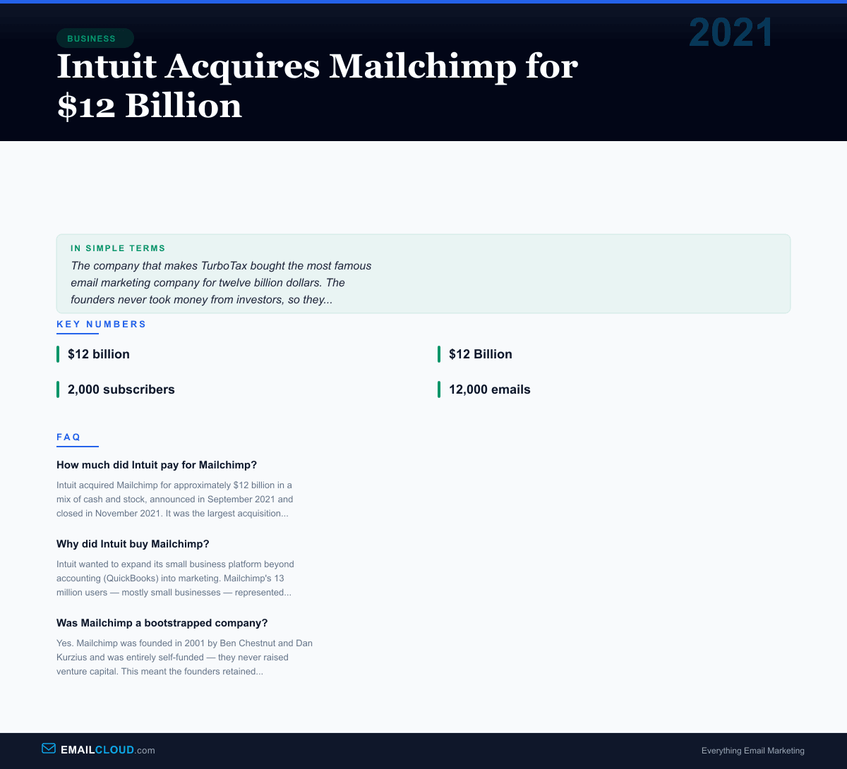 Intuit acquired Mailchimp for approximately $12 billion in a mix of cash and stock, announced in September 2021 and closed in November 2021. It was the largest acquisition in Intuit's history and the largest acquisition in email marketing history.