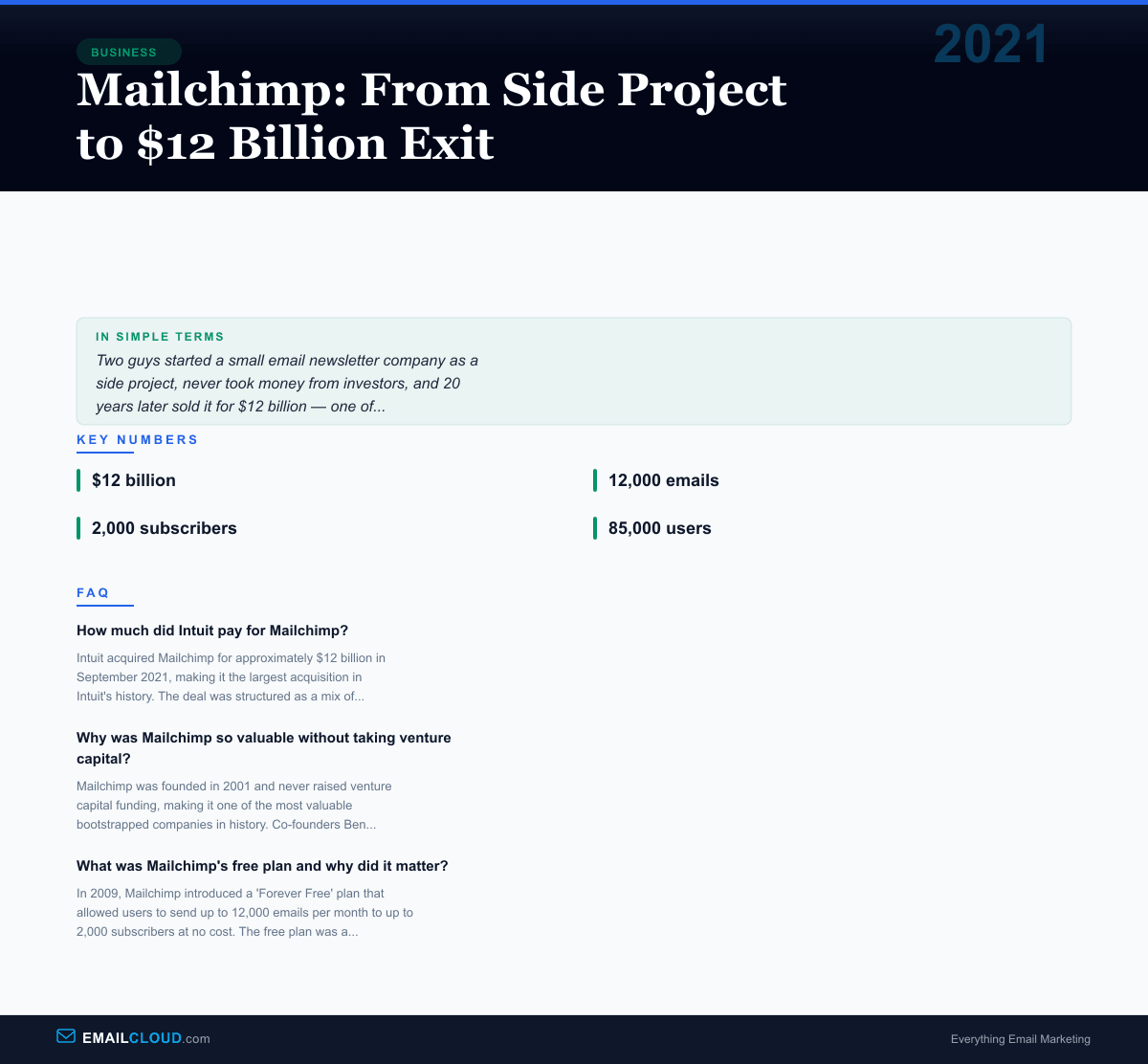 On September 13, 2021, Intuit announced it was acquiring Mailchimp for approximately $12 billion. The deal was staggering on multiple levels. It was one of the largest all-cash technology acquisitions in history. It made Mailchimp’s co-founders, Ben Chestnut and Dan Kurzius, billionaires several times over. And it validated one of the most improbable success stories in the email industry: a bootstrapped side project, founded during the dot-com bust, that never took a dollar of venture capital and grew into the dominant email marketing platform in the world.