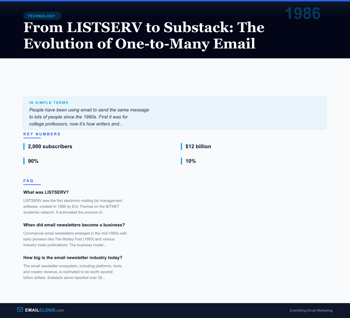 In 1986, a graduate student named Eric Thomas at the Ecole Centrale de Paris wrote a piece of software that would, in its quiet, unglamorous way, invent a media category worth billions. The software was called LISTSERV, and it automated something that had previously been done by hand: sending one email to many recipients at once.