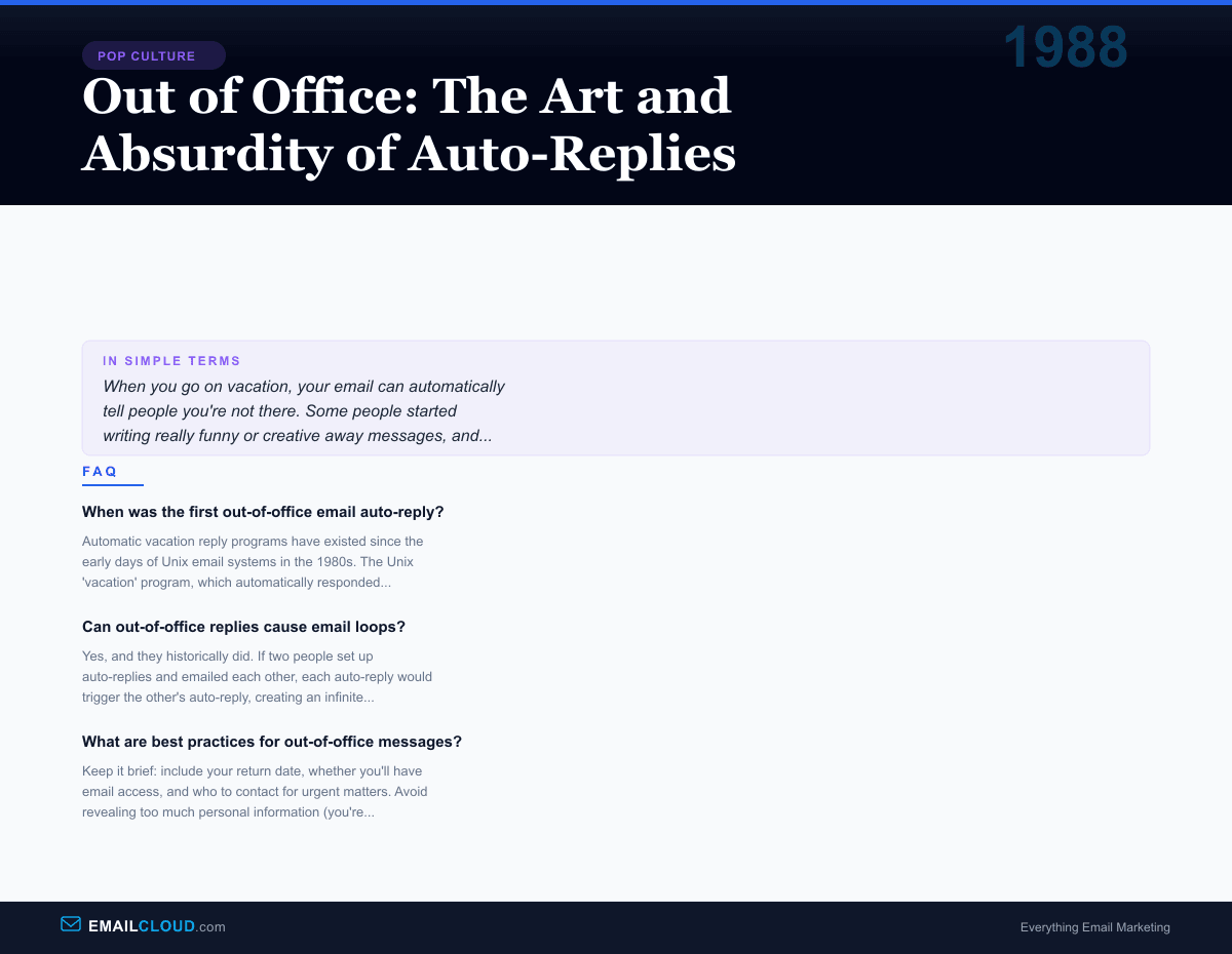 The out-of-office auto-reply is one of email’s most peculiar cultural artifacts. At its core, it’s a simple utility: an automated response telling senders that you’re unavailable. But over four decades, the OOO message has evolved from a bare-bones Unix program into a canvas for creativity, comedy, passive-aggression, and occasionally, genuine art. It is the only form of writing that most people compose knowing it will be read by people they didn’t intend to write to — and that strange dynamic has produced some remarkable results.
