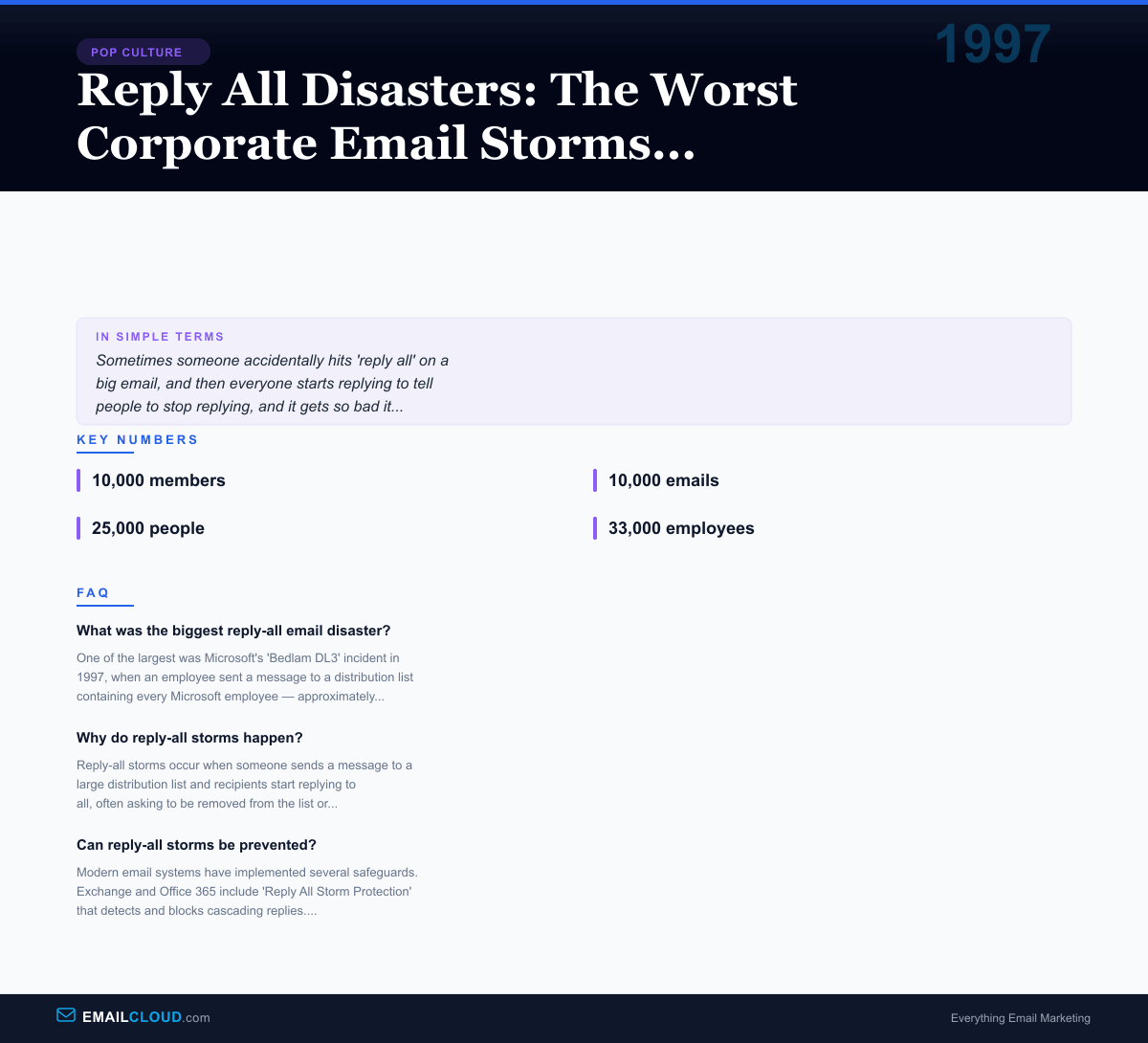 One of the largest was Microsoft's 'Bedlam DL3' incident in 1997, when an employee sent a message to a distribution list containing every Microsoft employee — approximately 25,000 people. The ensuing reply-all storm generated millions of messages, crashed servers, and required emergency intervention to stop. The incident became legendary in tech culture.