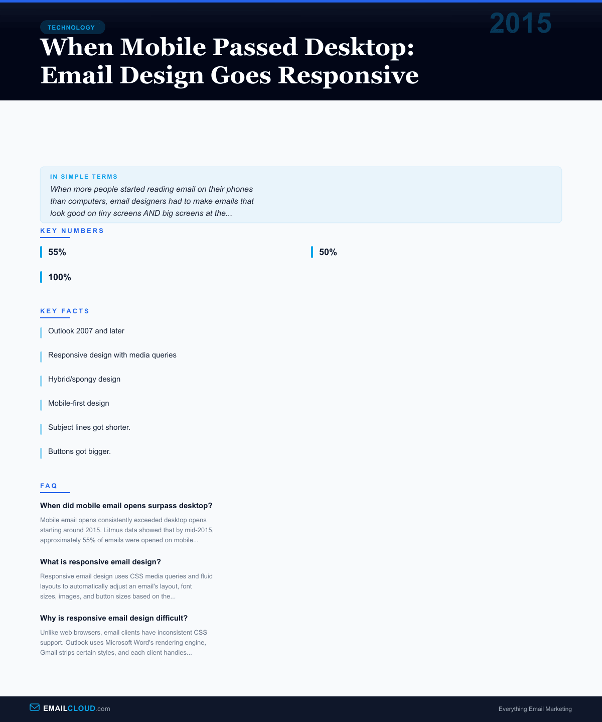 This wasn’t a surprise to anyone who’d been paying attention. Smartphone adoption had been climbing steadily since the iPhone launched in 2007, and mobile email usage had been rising for years. But crossing the 50% threshold forced a reckoning. Email designers could no longer treat mobile as a secondary consideration — it was the primary viewing environment.